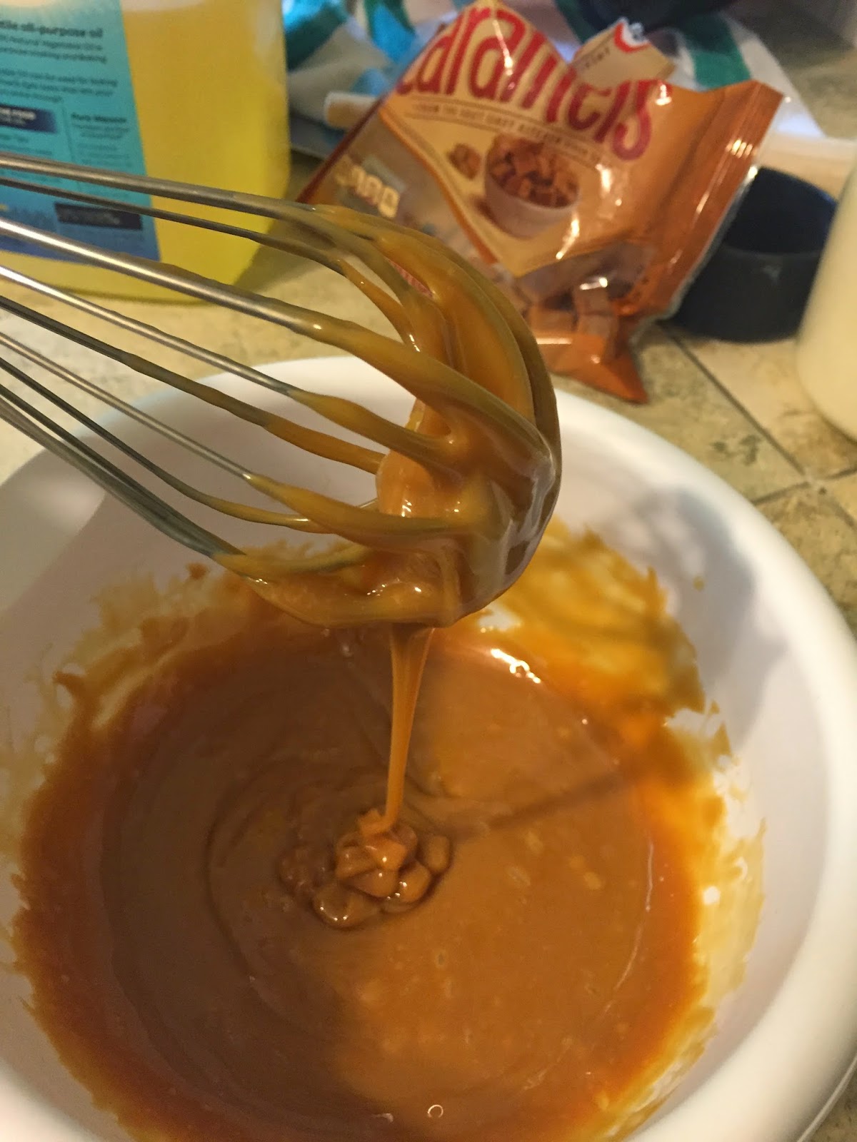 Now, after returning the dog to his owner, you can safely resume baking. Where were we? Ah, the good stuff: the caramel core. I used almost an entire 11 oz. bag of Kraft caramel squares. I say almost, because I ate 7 of them before I started baking. If you have self-control, use the entire bag. Unwrap and place into a microwave-safe bowl with 1/4 cup of heavy whipping cream. Microwave in 30 second intervals, stirring between each one, until it's a smooth caramel-like consistency. You'll want to be able to do this.
